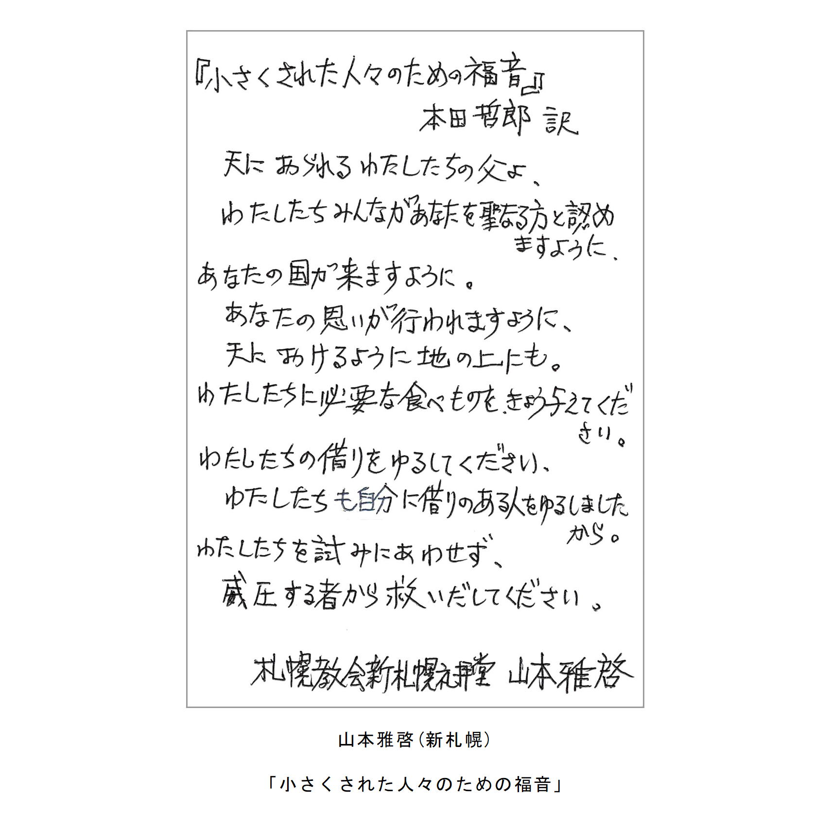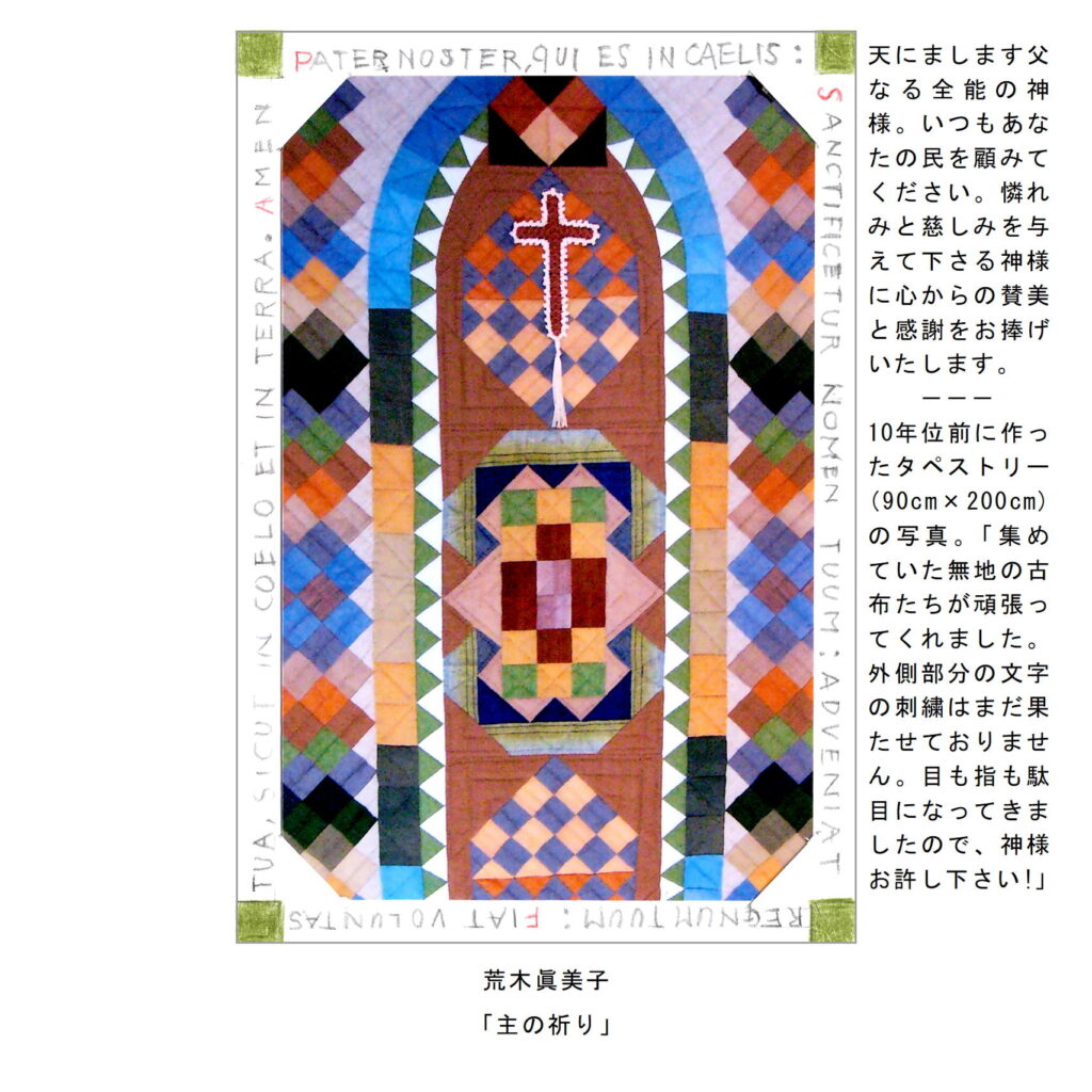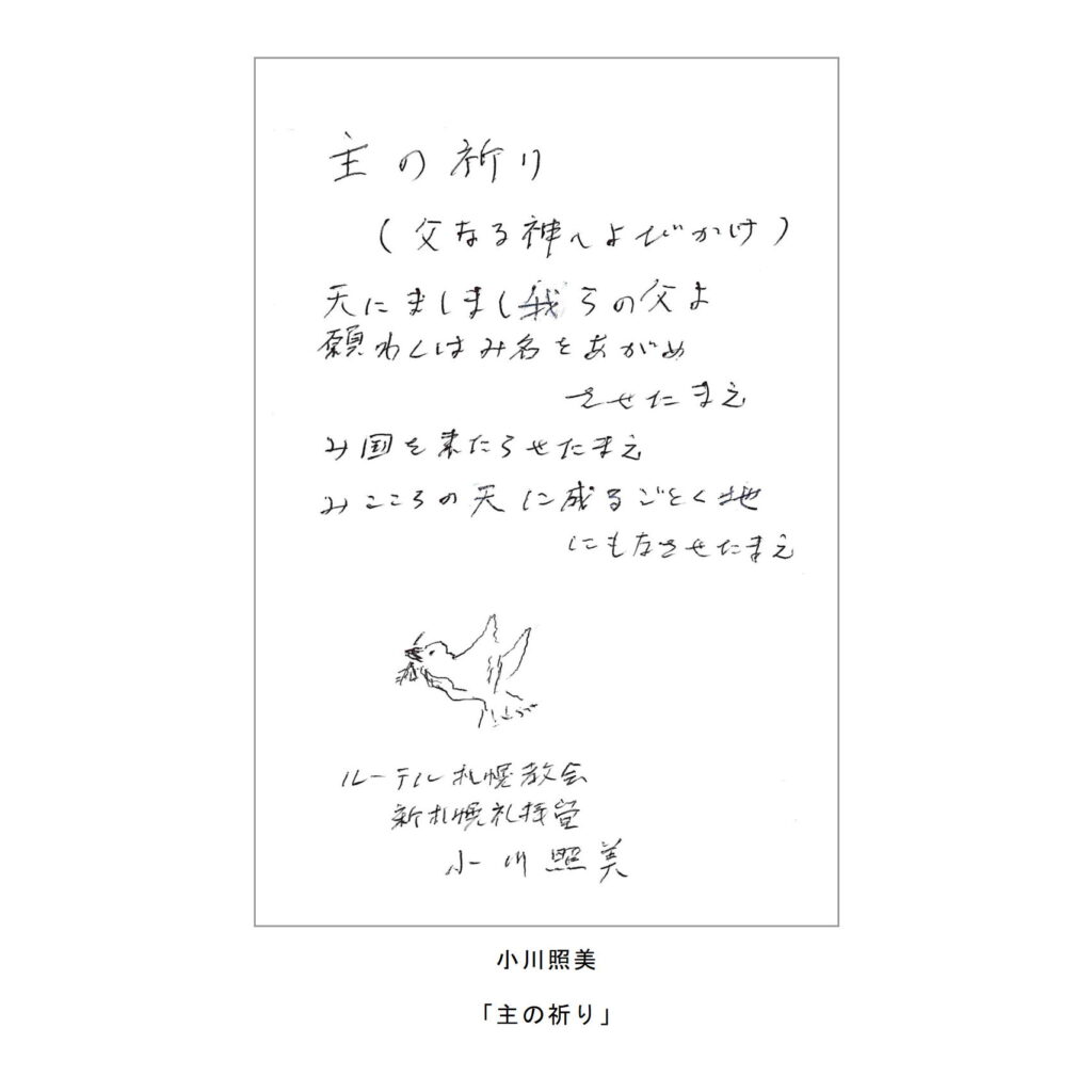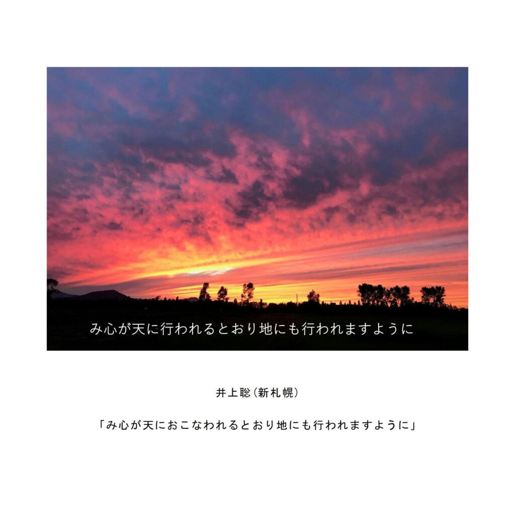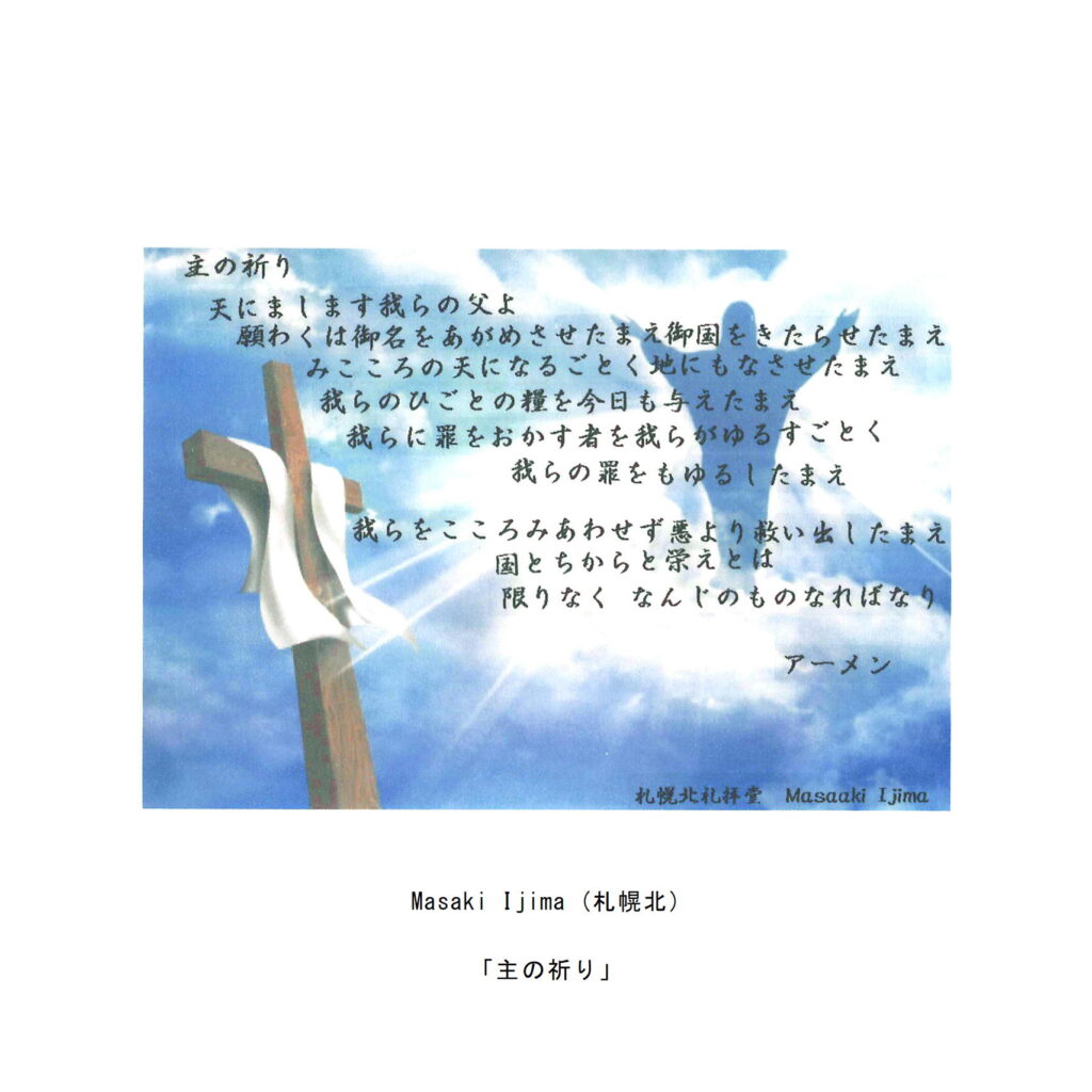 わたしたちの教区は広く、感染症の拡大がなくても簡単には集まりにくい現状があることは確かです。こうした中で、教区常議員会で話し合い、わたしたちの共なる信仰を表現し、わかちあう機会として、「ハガキで主の祈り展」というネット展覧会を企画致しました。提出要項にありますように、ぜひ教区のみなさんに参加していただき、信仰の涵養と交わりを深める機会としたいと願っています。重ねて申し上げますが、ぜひ“みなさん”に参加していただき、この展覧会を盛り上げていきたいと願っています。みなさんのご協力をお願いする次第です。
