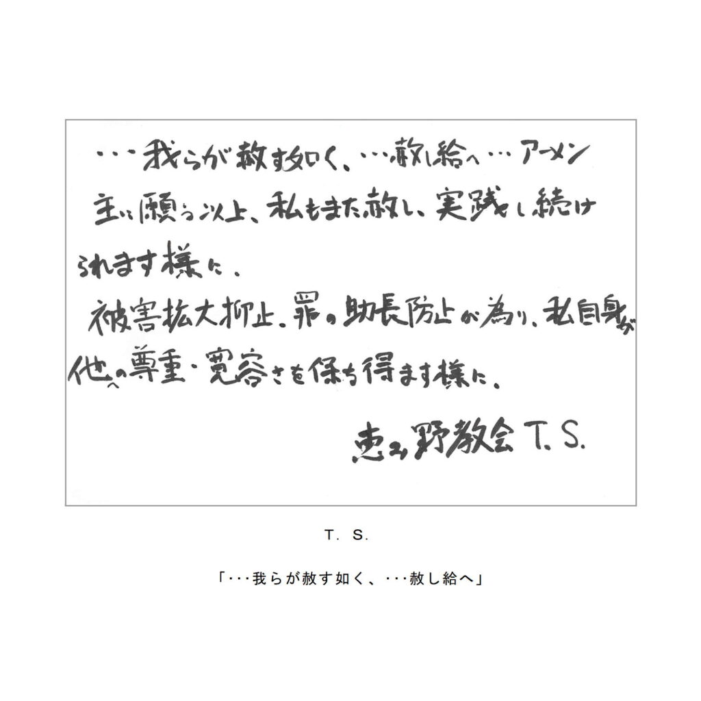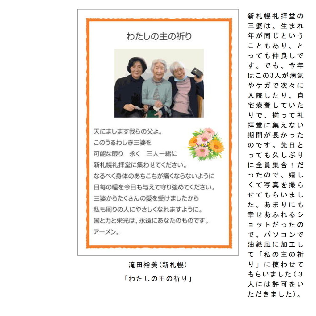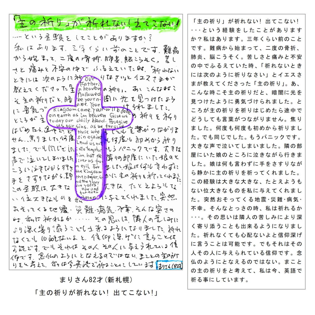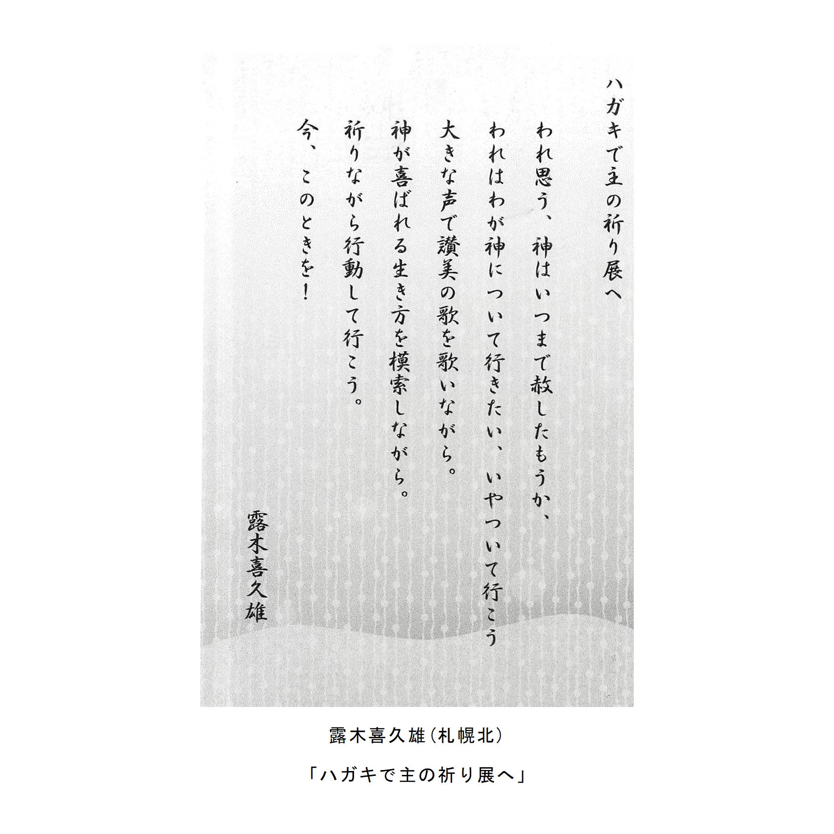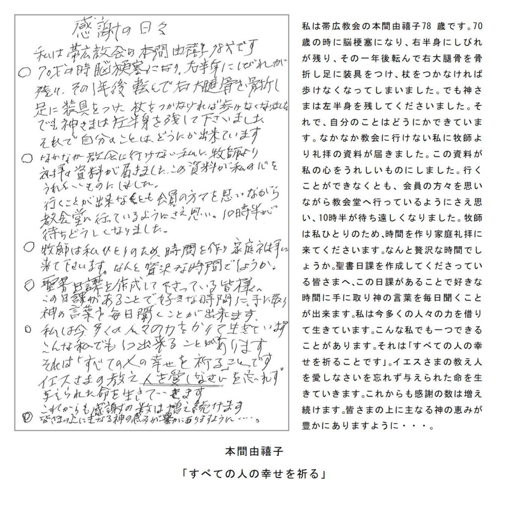 わたしたちの教区は広く、感染症の拡大がなくても簡単には集まりにくい現状があることは確かです。こうした中で、教区常議員会で話し合い、わたしたちの共なる信仰を表現し、わかちあう機会として、「ハガキで主の祈り展」というネット展覧会を企画致しました。提出要項にありますように、ぜひ教区のみなさんに参加していただき、信仰の涵養と交わりを深める機会としたいと願っています。重ねて申し上げますが、ぜひ“みなさん”に参加していただき、この展覧会を盛り上げていきたいと願っています。みなさんのご協力をお願いする次第です。