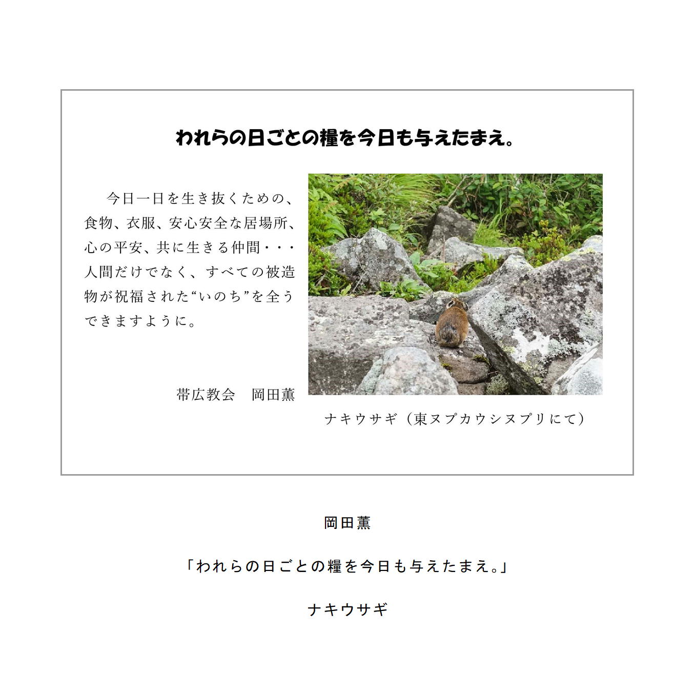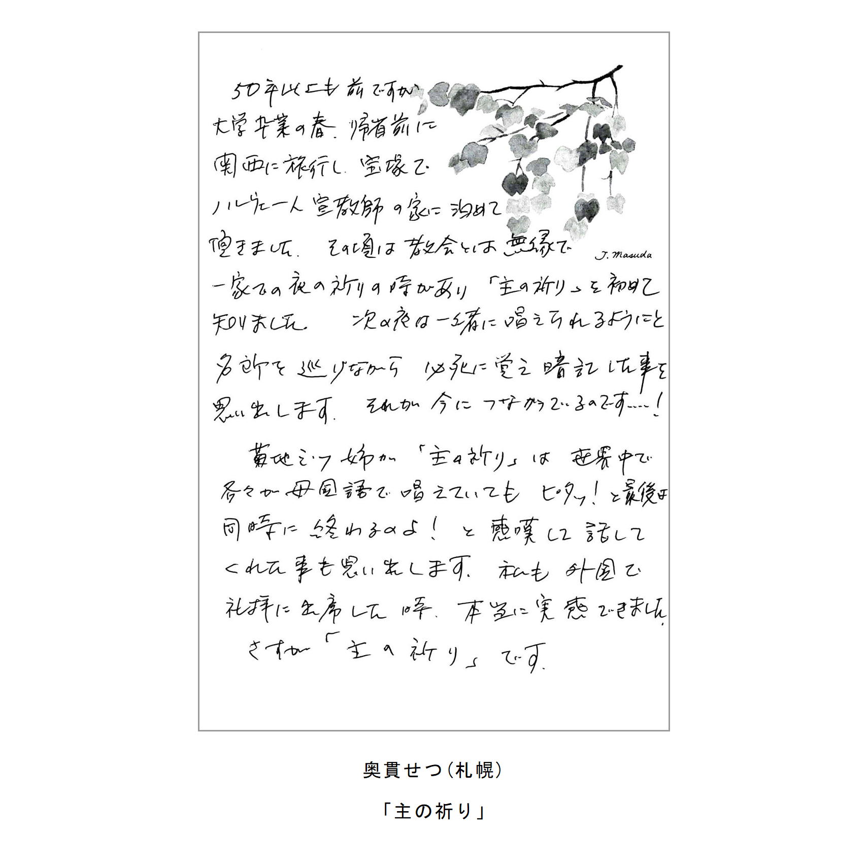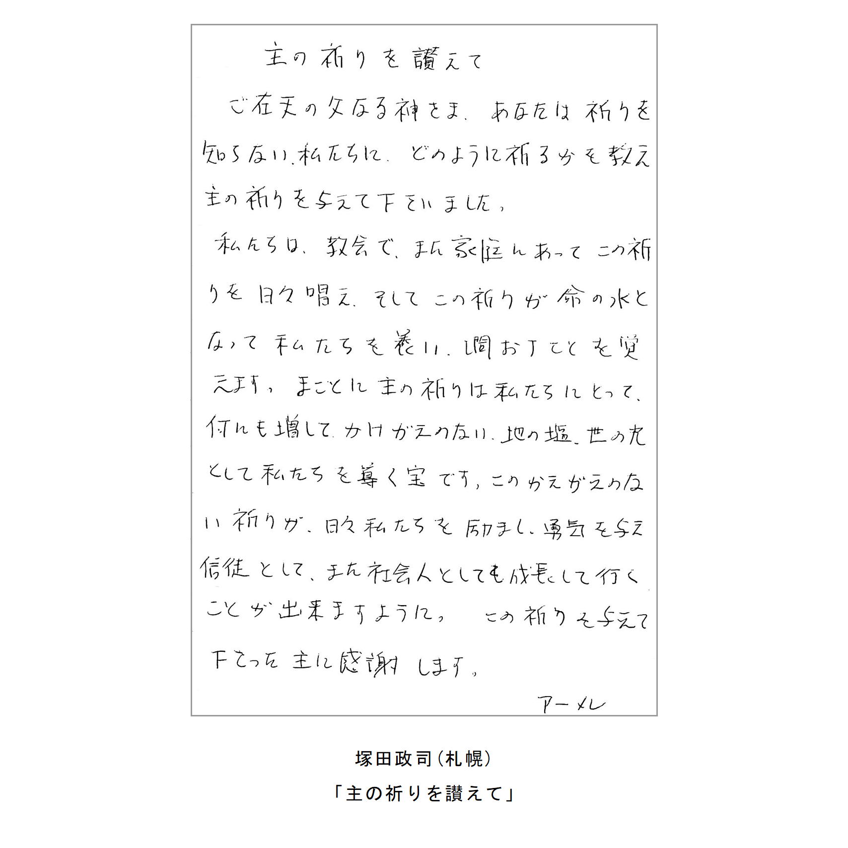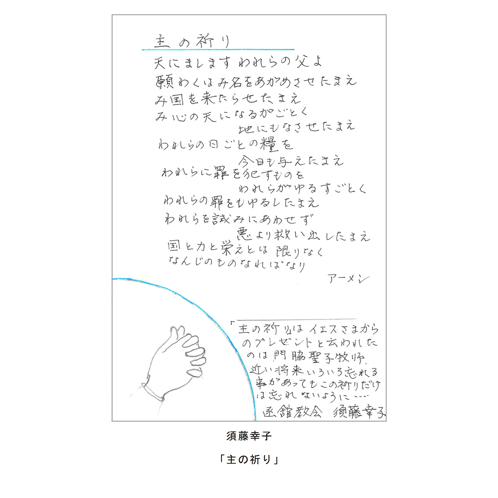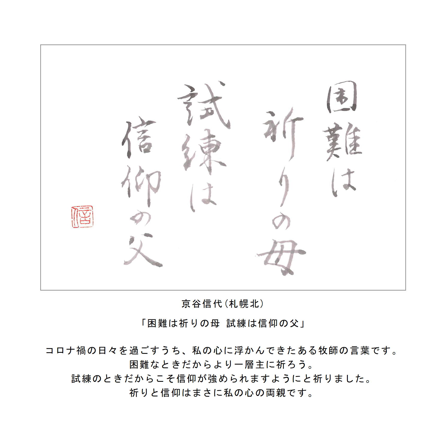 わたしたちの教区は広く、感染症の拡大がなくても簡単には集まりにくい現状があることは確かです。こうした中で、教区常議員会で話し合い、わたしたちの共なる信仰を表現し、わかちあう機会として、「ハガキで主の祈り展」というネット展覧会を企画致しました。提出要項にありますように、ぜひ教区のみなさんに参加していただき、信仰の涵養と交わりを深める機会としたいと願っています。重ねて申し上げますが、ぜひ“みなさん”に参加していただき、この展覧会を盛り上げていきたいと願っています。みなさんのご協力をお願いする次第です。