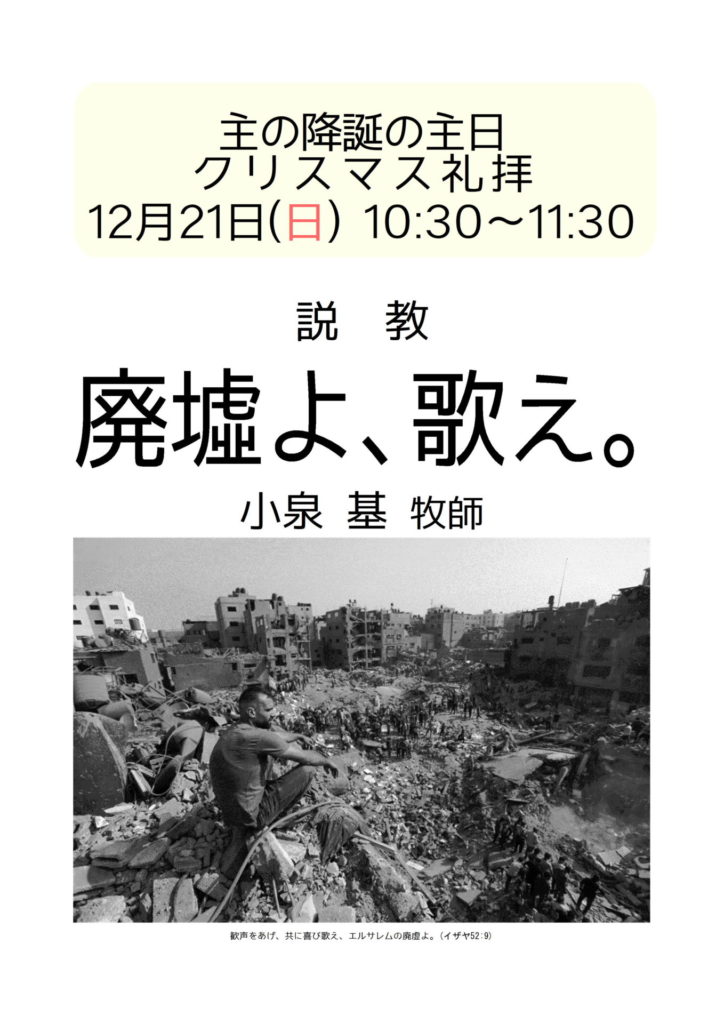 12月21日(日) クリスマス礼拝のご案内 2025年12月13日 最終更新日時 : 2026年1月5日 札幌礼拝堂日本福音ルーテル教会 12月21日(日)10:30~11:30 説教:廃墟よ、歌え。 小泉基牧師 *礼拝後、ホールでクリスマス祝会を致します。どなたでもご参加下さい。