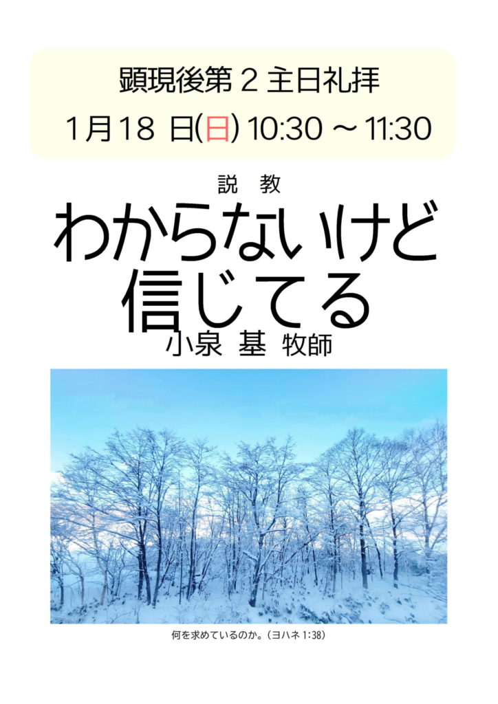 1月18日(日)顕現後第2主日礼拝のご案内 2026年1月12日 最終更新日時 : 2026年1月7日 札幌礼拝堂日本福音ルーテル教会 1月18日(日)10:30-11-30 説教「わからないけど信じてる」小泉基牧師 どなたでもご参加できる礼拝です。はじめての方もお越しをお待ちしています。