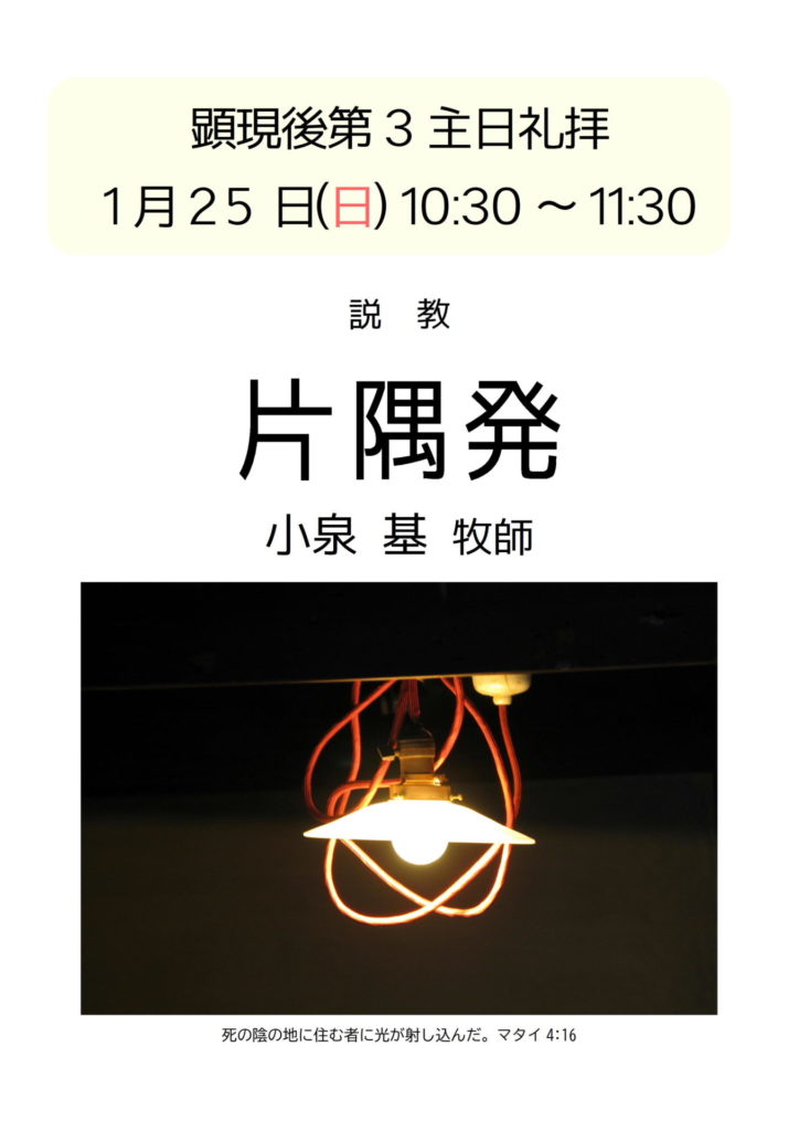 1月25日(日)顕現後第3主日礼拝のご案内 2026年1月19日 最終更新日時 : 2026年1月7日 札幌礼拝堂日本福音ルーテル教会 1月25日(日)10:30-11:30 説教「片隅発」小泉基牧師 どなたでもご参加できる礼拝です。メッセージが、あなたの心の片隅に届きますように。 お越しをお待ちしています。
