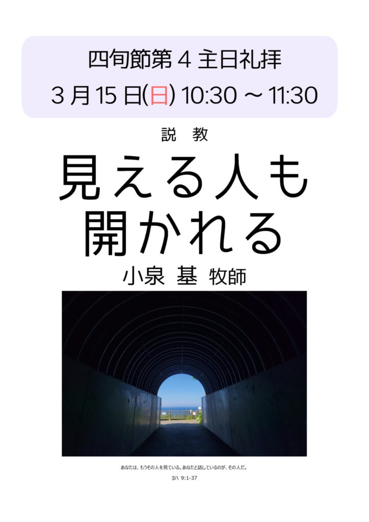3月15日(日) 礼拝案内 2026年3月8日 最終更新日時 : 2026年2月16日 札幌礼拝堂日本福音ルーテル教会 3月15日(日)10:30~11:30 説教「見える人も開かれる」小泉基牧師 どなたでもご参加いただけます。点字聖書聖書のご用意もあります。