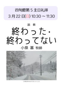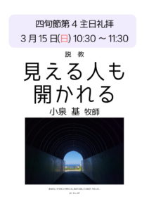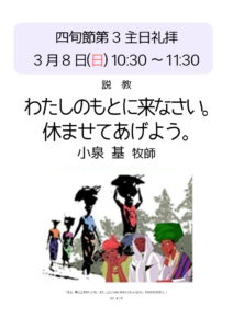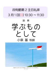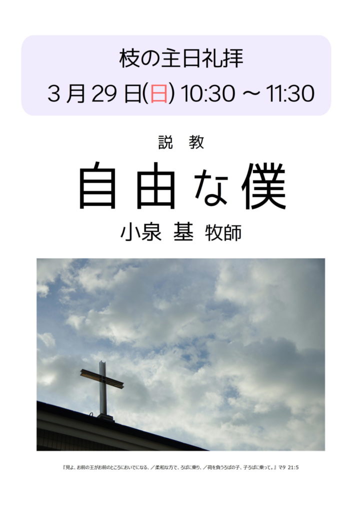 3月29日(日) 礼拝案内 2026年3月22日 最終更新日時 : 2026年2月20日 札幌礼拝堂日本福音ルーテル教会 3月29日(日)10:30~11:30 説教「自由な僕」 僕というのは、主人の下に生きるものですから不自由な存在ではないでしょうか。わたしたちの自由は、どこにあるのでしょうか。礼拝にお越し下さい。